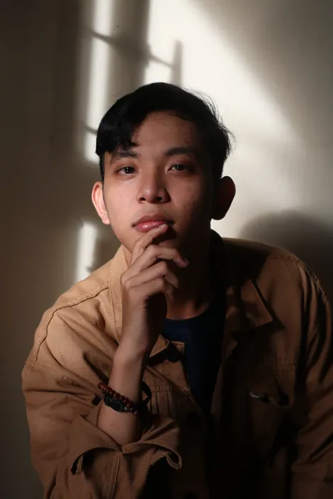 Wonwoo's preppy and stylish outfit from their "Mansae" music video with a striped sweater, khaki pants, and brown loafers.